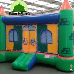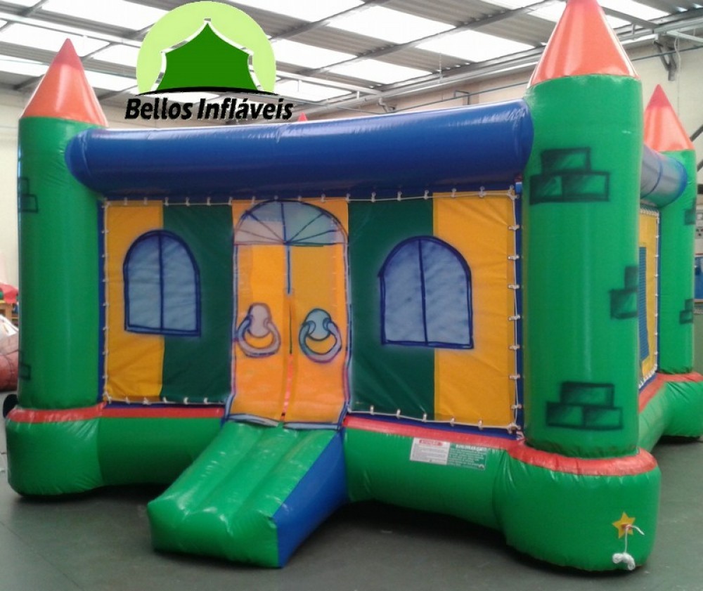 Castelo feito em KP 1.000 sendo o melhor material hoje no mercado, somente uma portinha de acesso para melhor segurança dos usuários, bolinhas de amarração para uma manutenção sem gastos, telas envolta do brinquedo para segurança e visibilidade dos usuários.