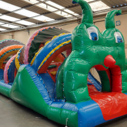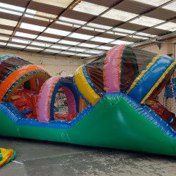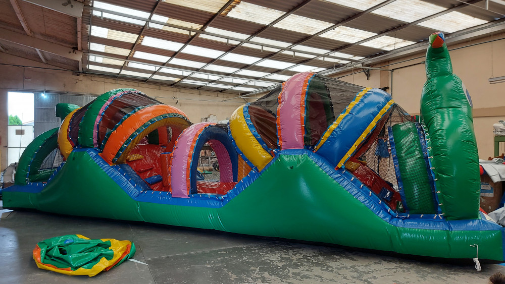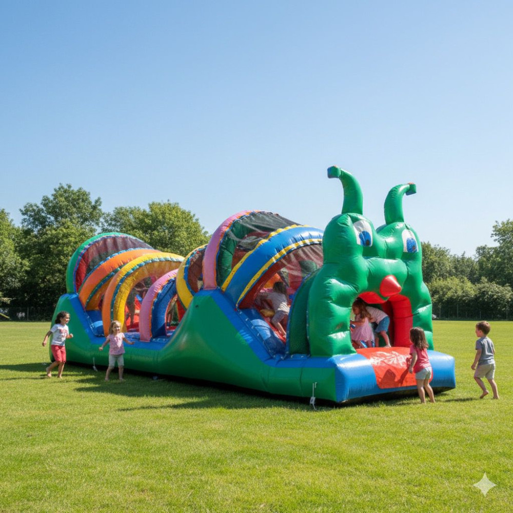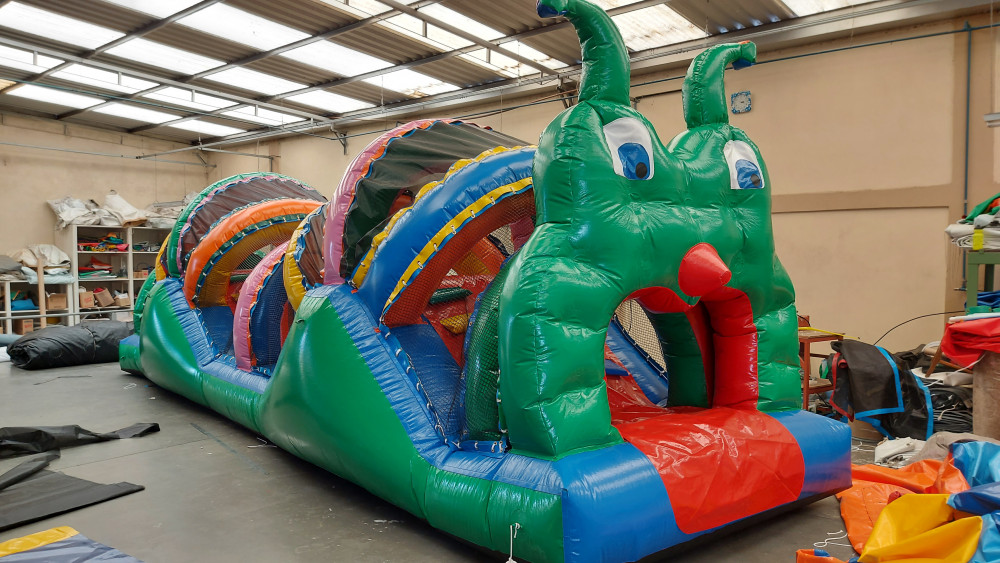 Centopeia feito em KP 1.000 sendo o melhor material hoje no mercado, uma entrada, possui 02 rampas de escorrega e 04 escada, somente uma portinha de acesso para melhor segurança dos usuários, telas dentro do inflável a cada 60cm com reforço em toda sua dimensão para uma manutenção sem gastos, arcos superior com total segurança, toda protegida com telas para a segurança dos usuários e a proteção do calor do sol.