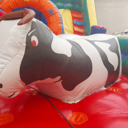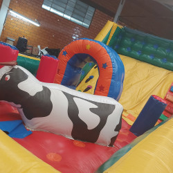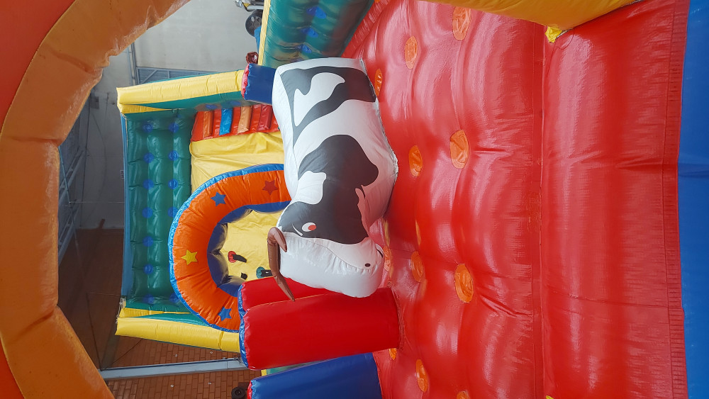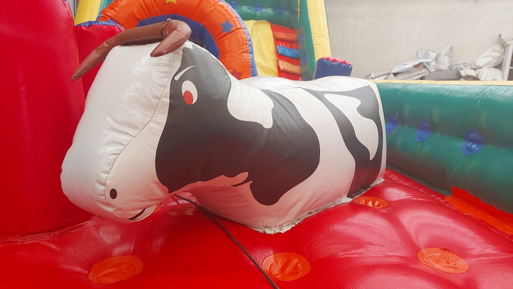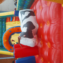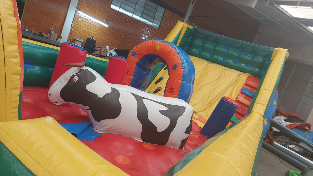 Tobogã feito em lona italiana e em KP 1.000 sendo o melhor material hoje no mercado, possui 01 rampa de escorrega e 01 escada, somente uma portinha de acesso para melhor segurança dos usuários, bolinhas no colchão com reforço para uma manutenção sem gastos, paredes superior com total segurança possuindo um sistema de não aglomeração de usuários com proteção.