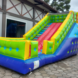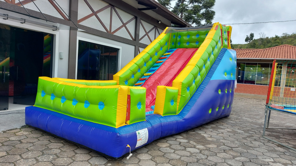 Tobogã feito em lona italiana ou em KP 1.000 sendo o melhor material hoje no mercado, não possui arco, tem 02 rampas de escorrega e 02 escada para proteger as paredes, somente uma portinha de acesso para melhor segurança dos usuários, telas dentro do inflável a cada 60cm com reforço em toda sua dimensão para uma manutenção sem gastos, paredes superior com total segurança possuindo um sistema de não aglomeração de usuários com proteção de tela para que não haja os famosos pulos para escorregar.